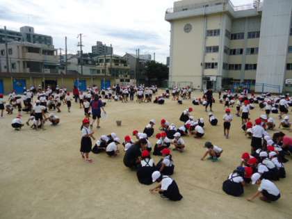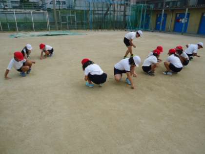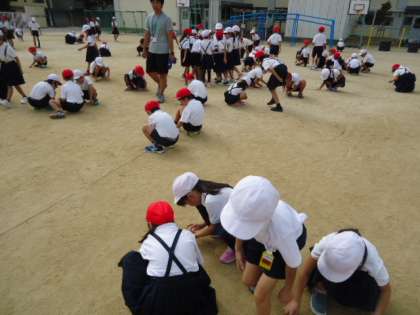 今日は、全校朝会の後、みんなで石拾いをしました。