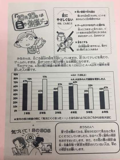 ほけんだより10月号に学年別の春の視力検査の結果と受診率を載せています。(9月29日に配布済みです。)