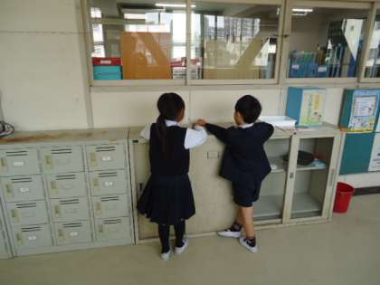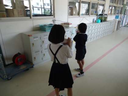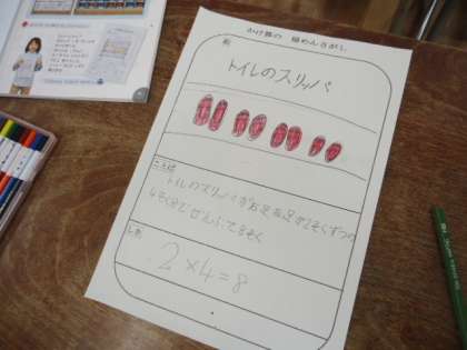 トイレに置かれたスリッパの数や、廊下にあるロッカーの数など、友だちと協力しながらかけざんを使って数を表すことができる場面を探すことができました。