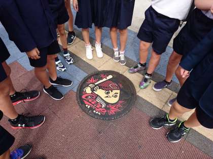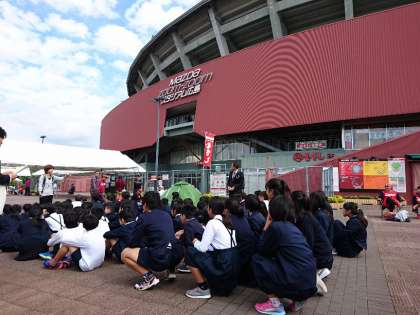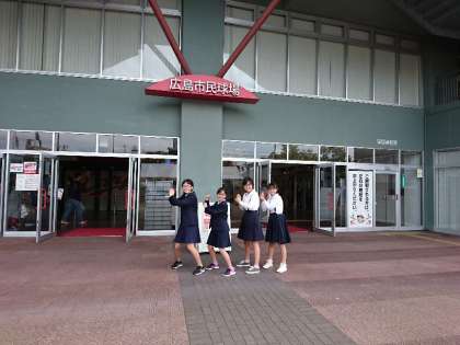 開場を待つカープファンの前で、O先生の薫陶を受けたにわかカープファンが、楽しく応援歌を披露しました。