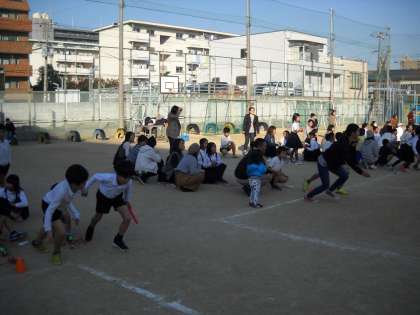 手をつないで走る「ペアリレー」や、二人の体の間にボールをはさみ、落とさないように走る「ボール運びゲーム」、や「なわとびリレー」を行いました。