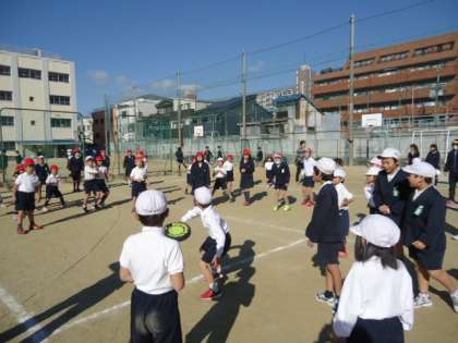 昨日同様、4年生も自分がとったディスクを1年生にゆずってあげたり、投げ方をゆっくりしたりと、優しさモード全開です。