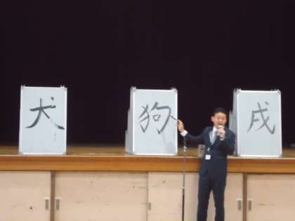 学校長からは、今年の干支にちなんで、「いぬ」の漢字について書き初め趣向での講話がありました。