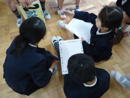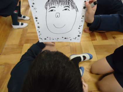 今日の児童集会は、たてわり班ごとに教室で「似顔絵リレー」をしました。