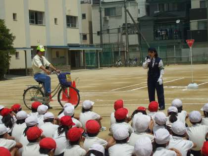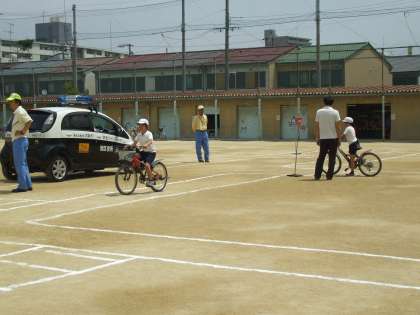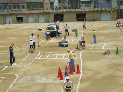 5月20日(火)、全学年で交通安全指導を受けました。運動場を街中の道路に見立てて、1,2年生は歩道の歩き方、3〜6年生は、自転車の正しい乗り方を指導してもらいました。平成25年12月1日から、改正道路交通法が施行されました。路側帯も車道と同じように左側通行になっています。警察の方が、「自転車は車扱いです。とにかく左側通行を徹底してください。」とおっしゃっていました。