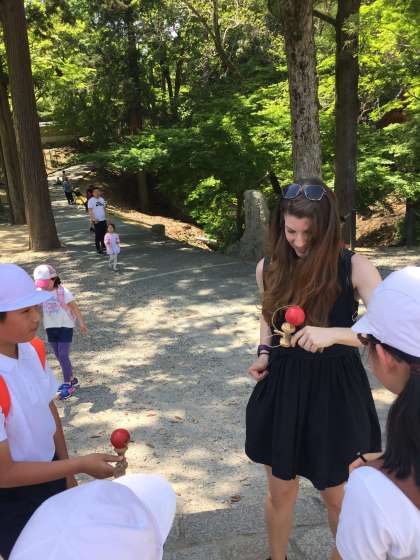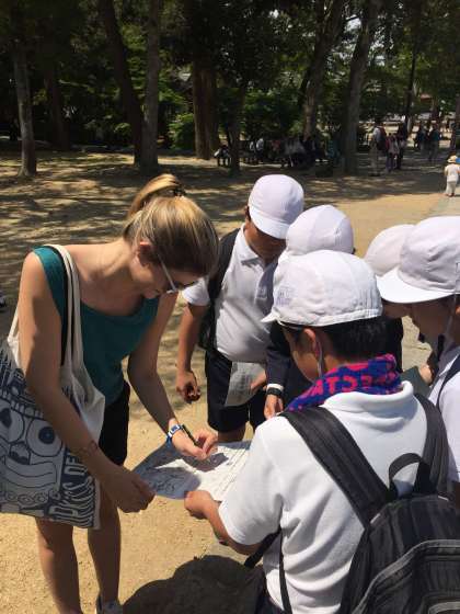 午後は、奈良公園で、外国の人にインタビューをする活動でした。「どこから来られましたか?」「これは日本の伝統的なおもちゃ『こま』です。知っていますか?」など質問をしました。