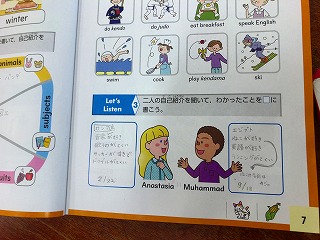 教材の中で、ロシア出身の女性とエジプト出身の男性の英語による自己紹介を聞き、子どもたちは聞き取ったことをメモしていきます。聞き覚えのある単語は、しっかりと理解できていましたが、まだまだ、個人差が大きいようです。