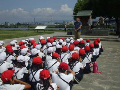 6月9日(月)、3年生は歩いて、淀川の河川敷にある「千人つか」を見学に行きました。1945年6月7日、大阪市の北東部に、第3回大阪大空襲がありました。城北公園や淀川河川敷に避難した人が多数命を落としました。その鎮魂のために、「千人つか」と刻印された庭石が置かれたのがここです。