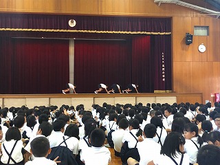 6月14日(木)、朝の集会の時間に美化委員会による発表がありました。発表は、掃除用具の使い方をクイズ形式で伝えるもので、ほうきなどの正しい使い方をユーモアを交えて演じていました。