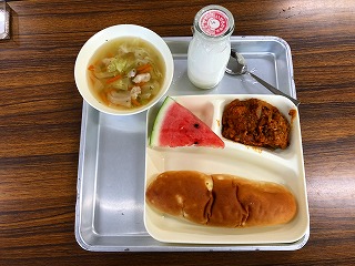暑さも本格的になり、夏本番という感じですが、本日の給食にはデザートとしてスイカが登場しました。おかずは、カボチャのミートグラタンに、キャベツやコーンの入ったスープです。パンも変わっていてサツマイモが入った「おさつパン」です。