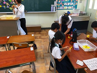 2部では、修学旅行で6年生が広島に持っていく折鶴を、縦割り班に分かれて全員で折りました。