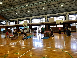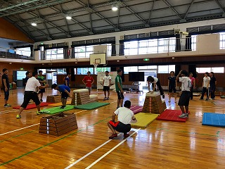 7月24日、猛暑の体育館で体育の実技研修会が実施されました。大阪市教育研究会体育部の器械運動領域部の先生4名を講師に迎え、台上前転の指導方法や、開脚跳びの補助の仕方などを教えていただきました。