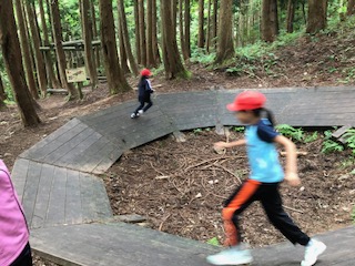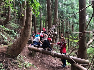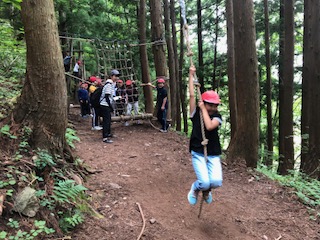 午前中の最初の活動、アスレチックスです。森の中にいろいろなステージがあり、班で協力してクリアしていきます。
