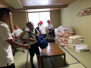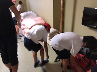 お世話になった部屋をきれいにしています。布団をたたんで、忘れものがないか確かめます。