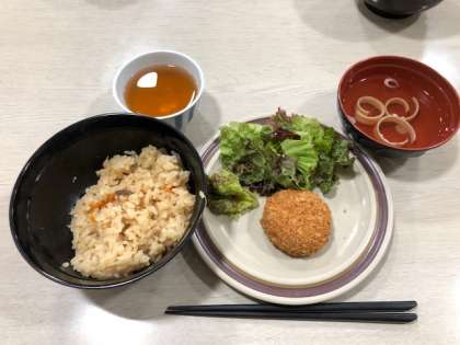 林間最後の食事は、かやくご飯とミンチカツです。