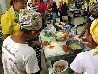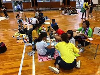 自分たちで作ったカレーを体育館で、班のみんなといただきました。多くの子どもたちがおかわりをしていました。