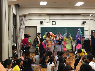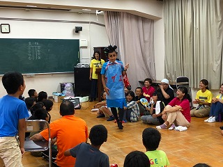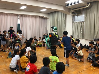 午後からは、旭区スポーツ推進委員さんによるスポーツ体験をして楽しみました。その後、多目的室で「ファッションショー」です。班のリーダーのオッチャンたちをモデルにして、手作りの衣装や飾りつけをします。見本で出てきた「サザエさん」は、その夜の夢に出てきた人もいたのではないでしょうか。