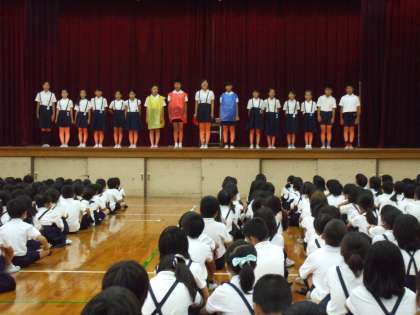 木曜日は、朝に児童集会が行われています。集会係が整列、進行、解散までを自主運営しています。この日は、講堂で保健委員会が「熱中症と食中毒の予防」をテーマにした発表を劇を交えたクイズ形式に仕上げました。1週間、毎日、昼休みに保健室に集まり、練習を重ねたようです。7月3日、本番の日、委員の人たちは、見事にやり切りました。クイズに対するみんなの反応も素晴らしく、苦労が実を結びました。劇を演じた人、クイズを考えた人、出した人。そして、この台本を作った人、お疲れ様でした。本当に素晴らしいできでした。