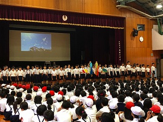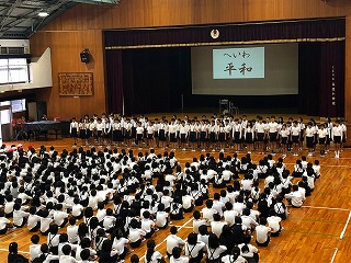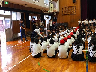 10月17日の広島への修学旅行を前に、今朝、6年生が1〜5年生に平和へのメッセージを伝える集会が行われました。
