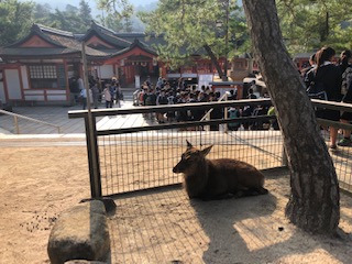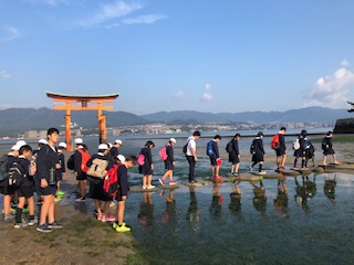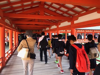 厳島神社の見学です。天気が良くなってきて、朝日が眩しいくらいです。たくさんの学校が来ているので、迷子に注意して見学します。