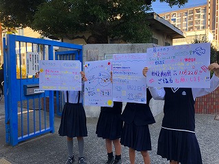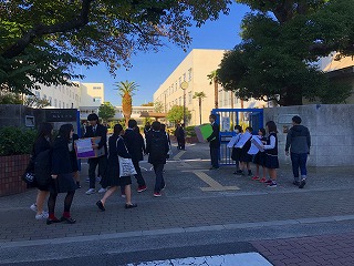 近隣の学校・幼稚園にも呼びかけて、できるだけたくさんの衣服を回収しています。この日は、旭高校の生徒にも手伝ってもらって、旭高校の校門前で協力を呼びかけました。高校生も、自分たちが着れなくなった服をわざわざ登校時に持って来て、寄付してくれました。