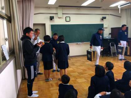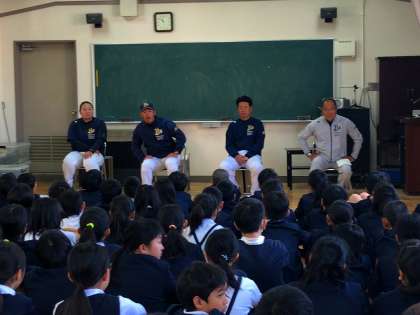 オリックスバファローズの少年野球チームのコーチをされている4人の方に来ていただき、授業をしていただきました。これまでも他学年でも野球を基にした簡単なゲームを教えていただきましたが、6年生ではキャリア教育の一環としてお話を聞かせていただきました。