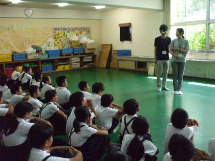 7月16日(水)、社会福祉協議会の方をお招きして、車いすとアイマスクの体験を行いました。始めに介助の方法を教わり、続いて実際の体験を行いました。車いすは、講堂にコースを作り、講堂を出て、給食室の前のスロープに移動しました。アイマスク体験は、生活科室を出発し、図書室前まで様々な障害物をよけながら、二人一組で介助する者とされる者を体験しました。