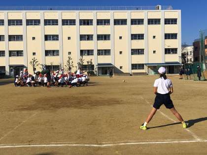 授業の中身は、まず、パスの仕方などの基本的な技能を教えていただきました。2人でパスをし合うのですが、正確なパスを心がけるため、受ける側が足を広げてその間にボールを通すことをしました。さすが、プロサッカーチームの方々、運動場の端から反対側で待つ子の足の間を狙ってパスを見せていただきました。(写真2枚目)結果は?