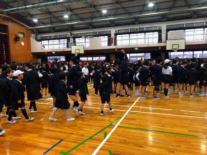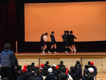 各班で一列になって、音楽に合わせて先頭の班長の真似をして踊ります。最初に集会委員の児童が、見本を見せますが、元気に踊る姿を見てみんなも恥ずかしさが吹っ飛んだようです。音楽が鳴るとリズムに乗って2曲を楽しそうに踊りました。