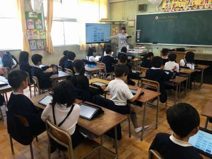 写真は認定証と、ICT支援員の支援の下、本日2年生で実施されていたタブレットを使った授業の様子です。