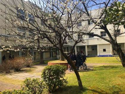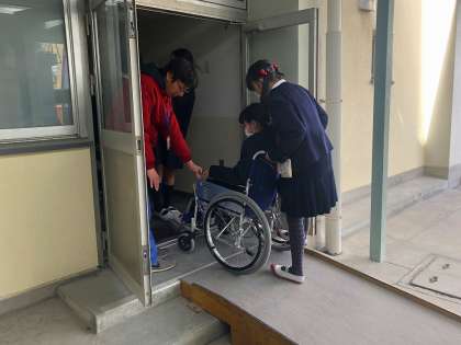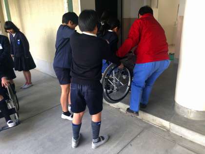 5年生では、2月27日に車いすの自走体験・介助体験をしました。この日は、大阪市立心身障がい者リハビリテーションセンターの方、10名ほどに来ていただき、車いすの操作の仕方や、介助の仕方、段差など障害物の対処法など90分間にわたり、教えていただきました。