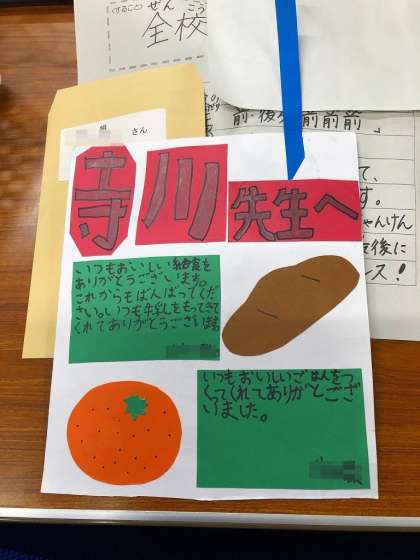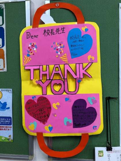 3月13日に6年生が、これまでお世話になった職員の皆さんに、感謝の気持ちを込めた手作りのメッセージを送りました。3人ほどのグループで担当の教職員に宛てたメッセージカードを手渡しで届けていました。