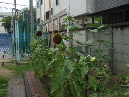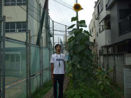 中庭の稲と芝生は、夏にもHPにアップしましたが、今回は学習園に1年生が種から蒔いたひまわりの活動記録です。大半は、この夏に咲き終わり、数本がこれから咲く状態です。ところが、今、まさに満開という1本があります。その1本のひまわりの成長ぶりが、目覚ましいので画像を載せました。写真を撮りに行っても、見上げるほどの大きさです。ひまわりだけの画像では、ピンと来ないので、6年生の安田先生に協力をしてもらい、ひまわりの横に立ってもらいました。3メートルを大幅に超える大きさであるのが、わかってもらえると思います。今度、学習園に行き、横に立って、自分の身長と比べてみてください。