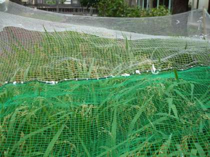 一方、中庭の稲ですが、よほどおいしく出来上がっているのか、このところスズメが集団でやって来て、ネットの上から、またネットの中に入り込んで、お米が“食べ放題”状態になっています。気が付けば追い払っているのですが・・・