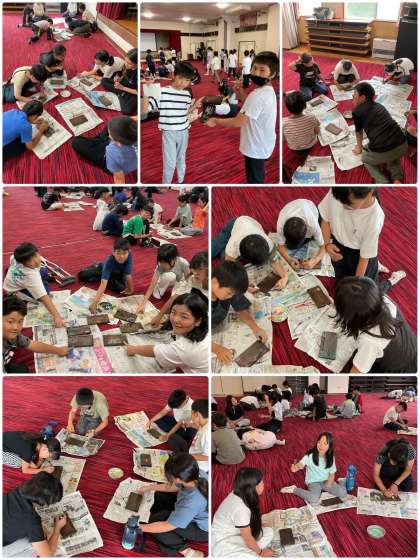 大広間で昨日磨いた焼き板に、絵やメッセージをかきました。思い出を作品にすることができました。