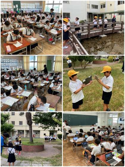 2組と4組は理科。タブレットの使い方を確認し。中庭でこん虫さがしをしました。たまたまタブレットにとまった虫を友だちが撮影することができました。