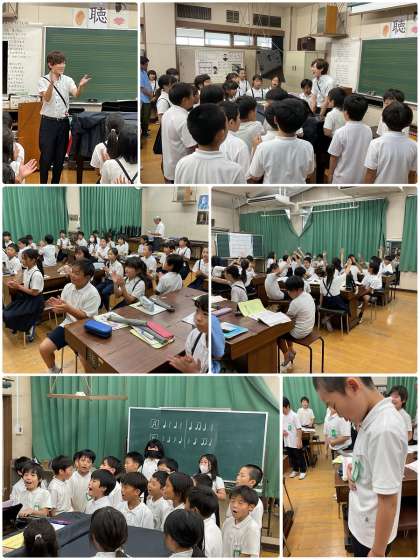 3時間目は4年1組。音楽「せんりつのとくちょうを感じ取ろう」を学習しました。『ゆかいに歩けば』の曲の中にはスタッカートがあります。とても上手に歌えているのですが、もっと弾むように歌うにはどうしたらいいかな?と、おなかに手をあてながら歌いました。「少し前にあるろうそくの火を消す感じで歌ってみよう」の言葉で、さらに上手な歌声になりました。