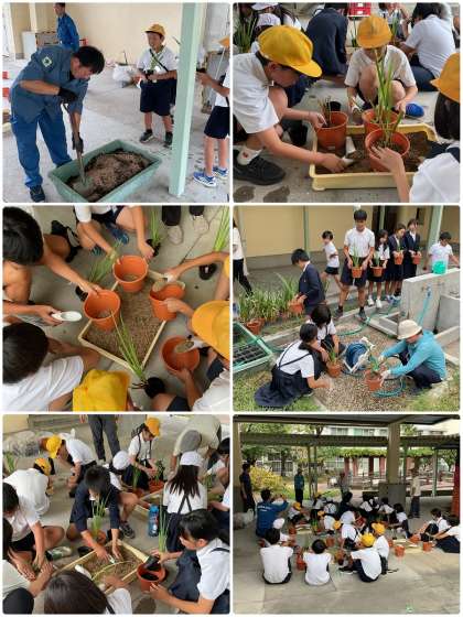 1学期から飼育栽培委員会で水やりを欠かさず、暑かった夏休みも乗り切った花菖蒲。そらに大きくなるようにと、植木鉢を入れ替えました。「冬の間も、土の中ではしっかり生きているんですよ」と、花菖蒲について教えていただきました。一人一人名札を書きました。これからも大切に育てていきましょう。