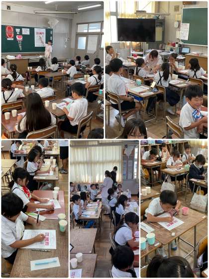 歯科衛生士にお越しいただきました。赤く染まった歯を見てにこっと笑顔を見せる子どもたち♪正しく歯をみがかないと...えらいこっちゃ!!今日からしっかり歯をみがこうという気持ちを持つことができました。「給食の後は、歯みがきがしたい」という子もいました。歯科衛生士さんご指導ありがとうございました!