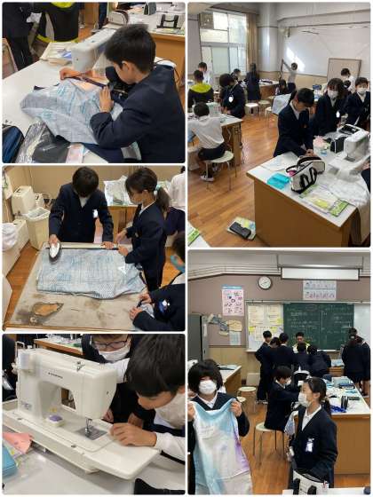 エプロン作りの真っ最中です。慎重にミシンで縫っていきます。下糸を出したりセットしたりするのが難しいですね。家でも自分でアイロンがけしている子もいるかもしれません。家庭科で学習したことは、生活に活かすことが大切です。家でもやってみましょう!