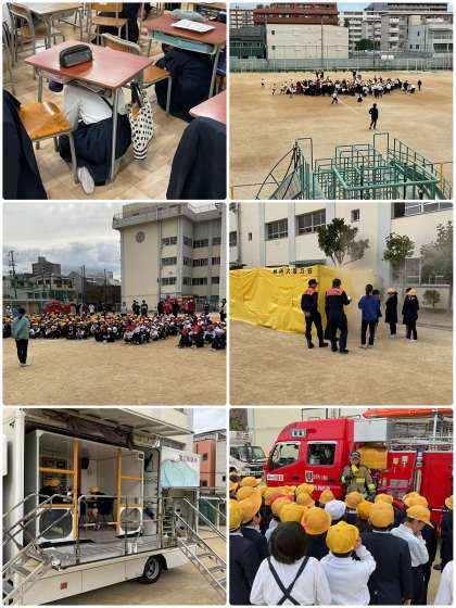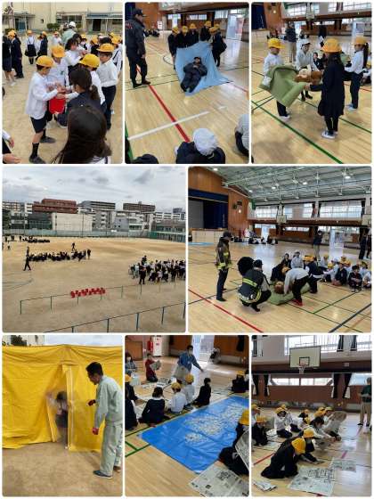 続いて旭区役所、旭消防署、そして高殿地域連合協議会の皆様と、合同で防災学習を行いました。高殿地域は日頃から防災に力を入れていて、「自助・共助」の下地があります。高殿っ子として、自分の命を守ること、まわりの人も大切にすることを、体験を通して考えました。今日の子どもたちの様子は、旭区長様、副区長様をはじめ多くの方にご覧いただくことができました。皆様のおかげで良い防災学習となりました。感謝