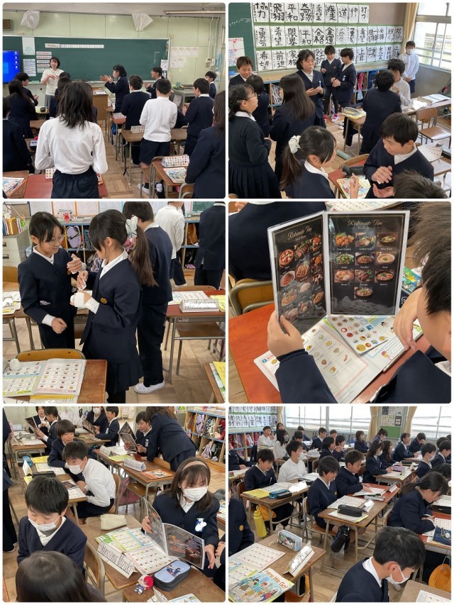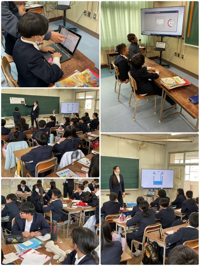 2年2組の道徳、3年生の自立活動、6年3組の算数、5年2組の英語の様子です。