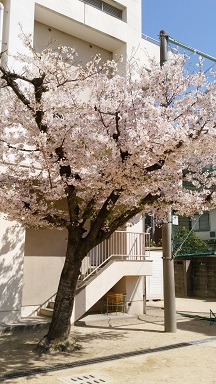 4月9日の校内の桜です。児童の新しい出発を寿いでいるようですね。北校舎から講堂横の桜です。