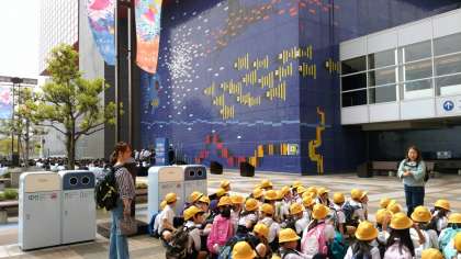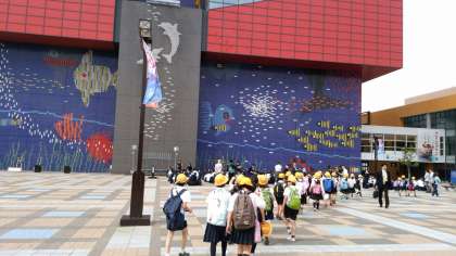 この後、班ごとに見学活動をするので、先生の注意をしっかりと聞いています。さあ、どんな生き物と出合えるでしょうか。