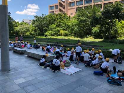スカイビルの下にある緑地の前で、みんなで仲よくお弁当タイムです。
