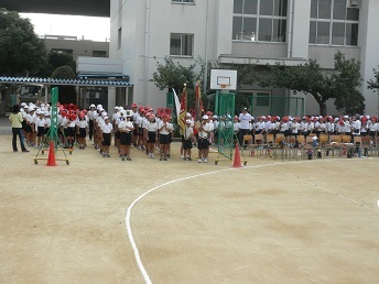 9月29日(月)1限目、2限目と全体練習を行いました。入場行進や開会式、閉会式、応援合戦の練習をしました。写真の1枚目は入場行進、2枚目は運動会の歌や校歌を練習しているところです。