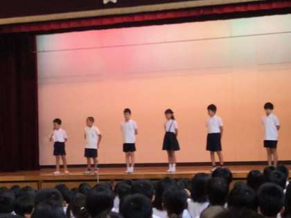 次に、各学年の代表児童が舞台に上がり、それぞれが1学期に頑張ったことやうれしかったことなどを、自分の言葉でしっかりと発表しました。全校児童の前でしたが、みんな堂々と立派な態度で発表していました。