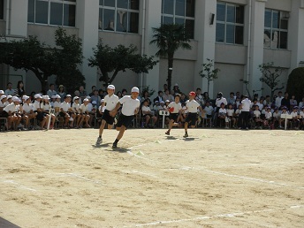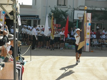 10月7日(火)に、さわやかに晴れ渡った秋空のもと、平成26年度の運動会を行いました。天候により順延し、ご迷惑をおかけいたしましたが、多くの保護者・ご家族・地域の皆様に来校して頂きました。子どもたちに温かい声援を頂戴し、まことにありがとうございます。当日の様子を紹介してまいります。写真の1枚目は校旗を先頭に入場行進が始まったところです。にこやかに胸を張って入場しました。2枚目は午前の応援合戦です。毎日残って練習しました。とても凛々しかったですよ。3枚目は3年生の個人走です。全力疾走しました。