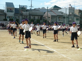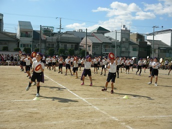 写真は4年生の学年演技のエイサーです。エイサーは沖縄本島の盆踊りという意味だそうです。手にはパーランクーという沖縄の鋲留(びょうどめ)片面枠太鼓を持っています。掛け声とパーランクーの音が心にしみてきました。