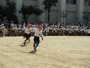 写真は1枚目が1年生個人走、2枚目がこれから小学校に入学するお友達による「学校へ行こう」です。どちらも広い運動場を思いっきり走りました。